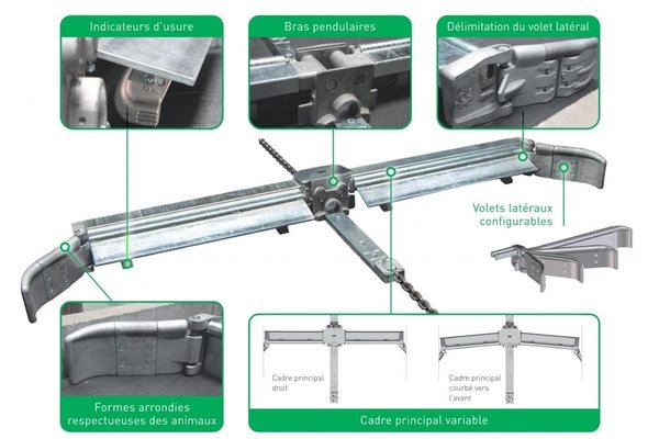 ► Les multi-racleurs et racleurs « V » ont été élaborés pour avoir une grande résistance aux charges de tractions notamment dans les systèmes pailleux (aire paillée, logettes avec paille etc). Leur robustesse et leur évolutivité permet ainsi un travail sur du long terme. Le combi-racleur sera davantage utilisée dans les bâtiments ou les effluents sont à tendance plutôt légère (lisier) voire caillebotis.